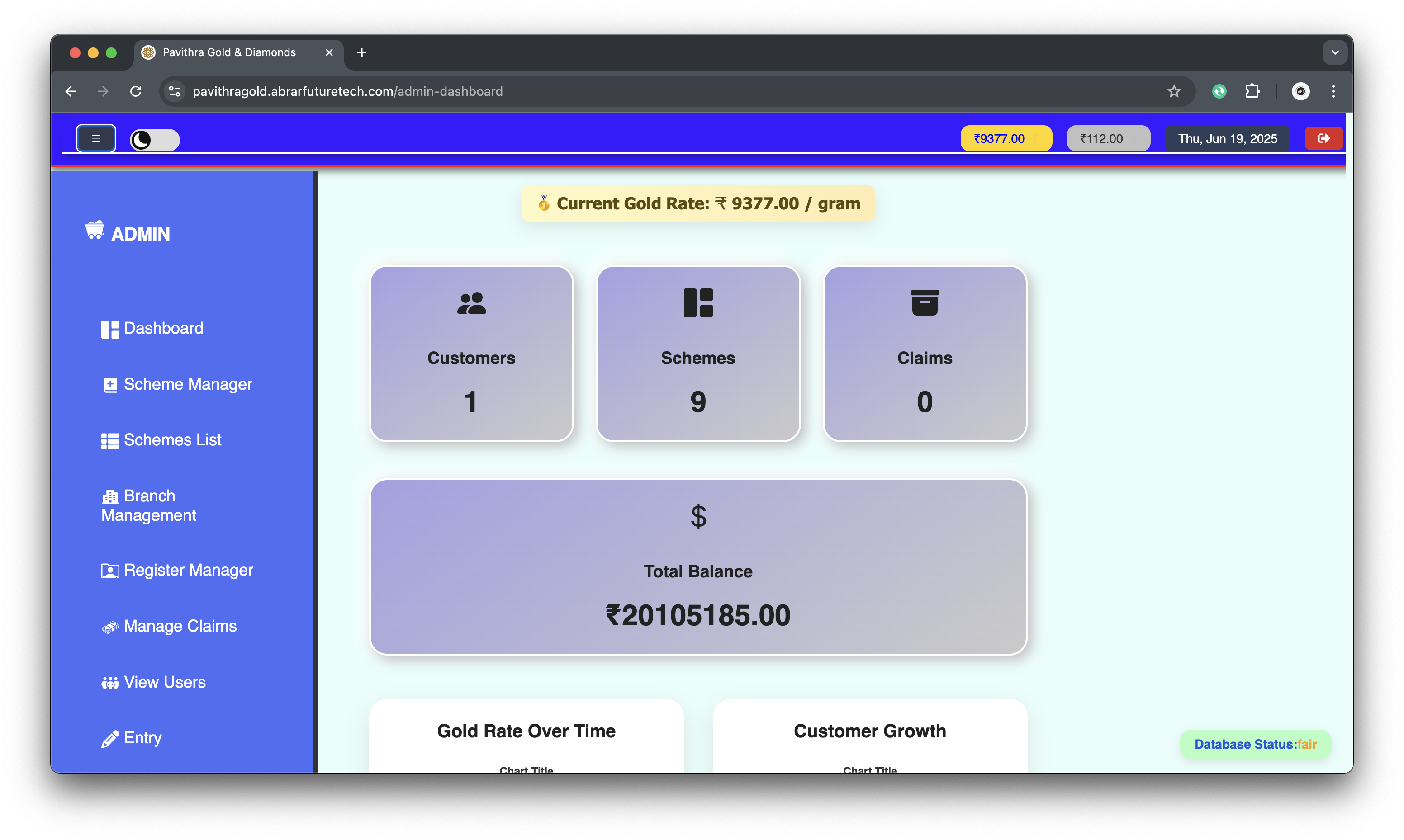 This project is a comprehensive, role-based digital platform developed to streamline and modernize the operations of gold investment schemes offered by jewellery businesses. It allows administrators, branch managers, and customers to seamlessly interact within a centralized system, ensuring transparency, real-time gold tracking, and complete control over scheme management.